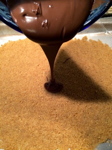 My intention for this dessert was to make a chocolate bark with a graham cracker crumb crust. However, since I am a person that cannot have nice things, I ended up with chocolate bark/graham cracker crumb combo. I made the graham cracker crust, and was in the middle of pouring the melted chocolate over it, when the bowl slipped out of my hand and onto the crust.